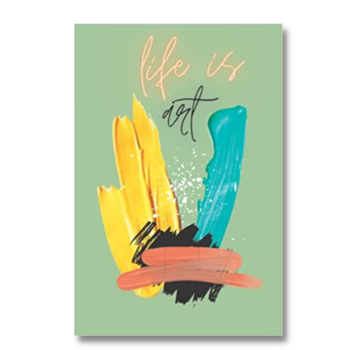 Notebook journal that showcase a different strips of paint and paint splatter with life is art quote.