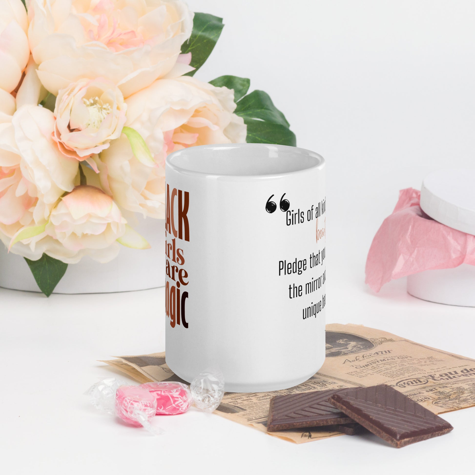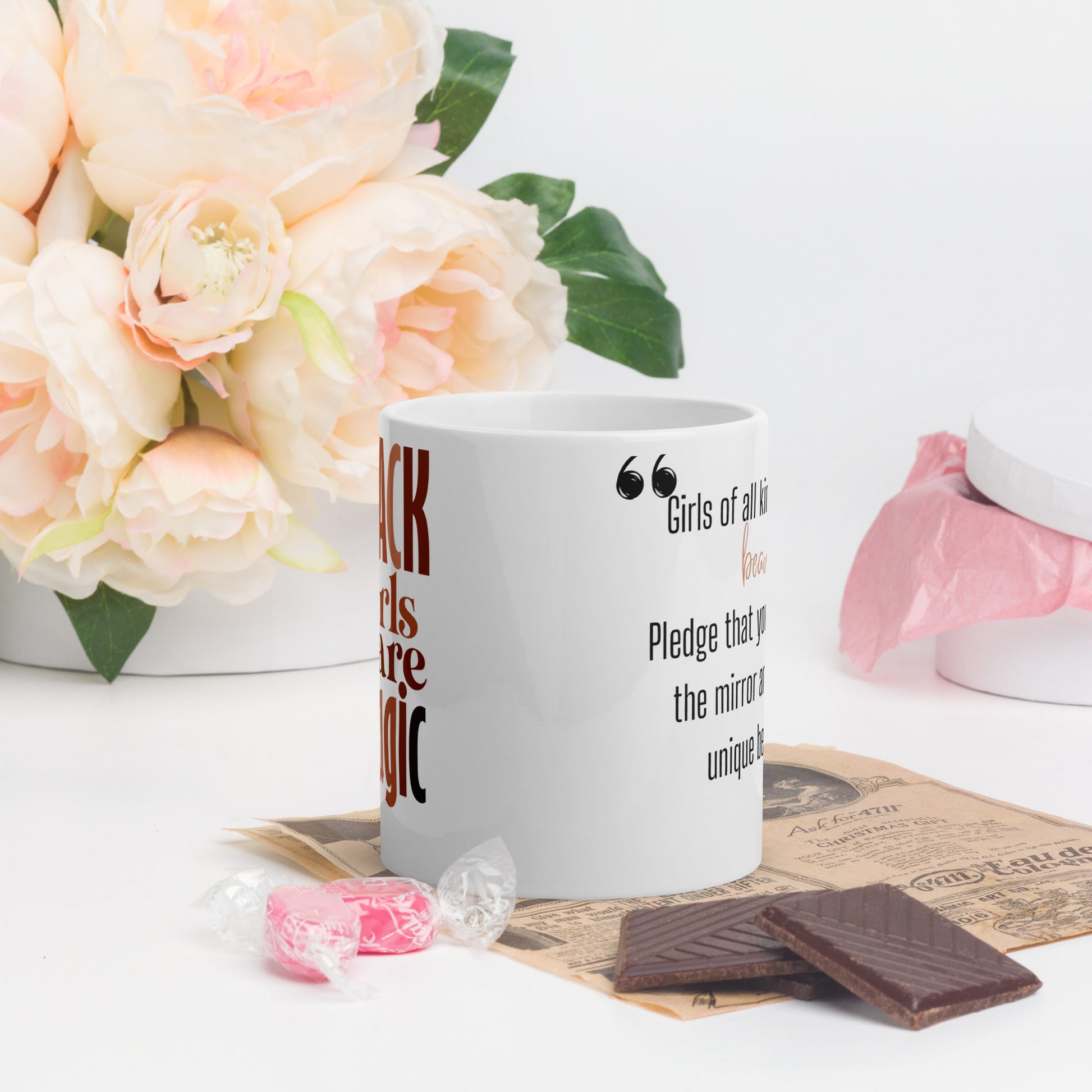 This ceramic mug is the perfect blend of function and elegance. Ideal as a gift or an everyday essential for your dreamy cup of tea. This mug displays a beautiful curvy/full figure woman on front side to show that women of all sizes are beautiful and full of magic and an inspirational quote on the back side.